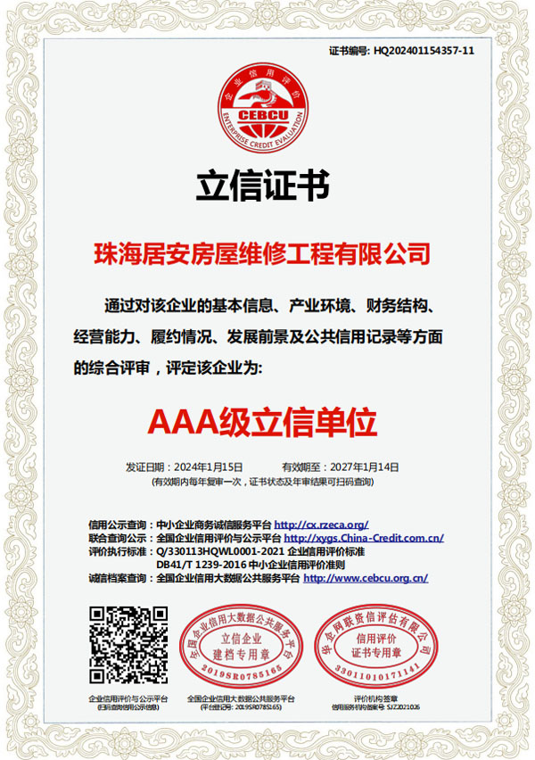 珠海居安房屋維修工程有限公司成立于2020年,是一家專注房屋維修的公司。我們擁有各類型專業(yè)人才,業(yè)務(wù)包括老舊建筑翻新改造、外墻空鼓修復、防水幕墻養(yǎng)護、外墻預置構(gòu)件拆除更換、供排水管網(wǎng)改造、墻面翻新、鋼制結(jié)構(gòu)建筑構(gòu)建及折除,外墻清洗及裝修裝飾。